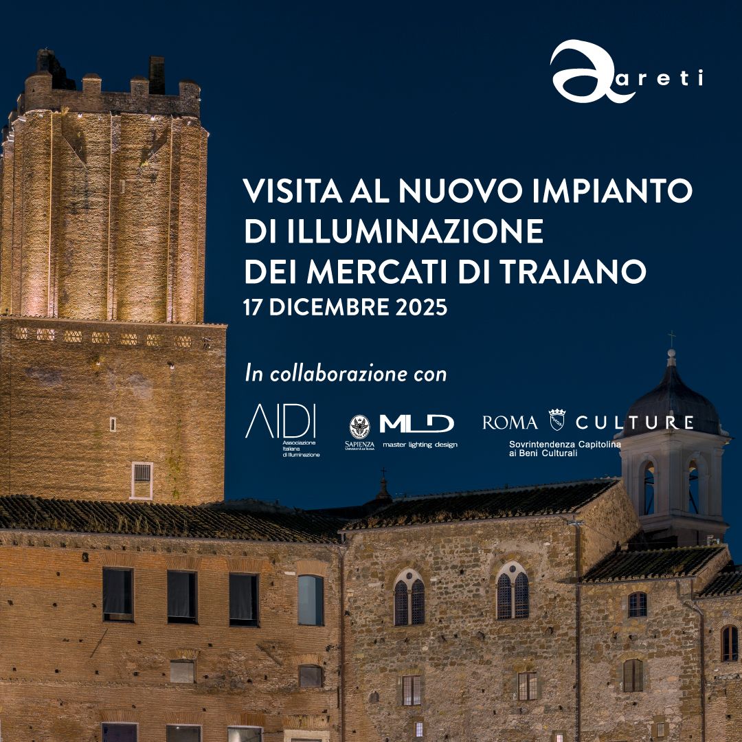 L’ Open Day MLD si svolgerà ai Mercati di Traiano, dove potrai esplorare il nuovo impianto di illuminazione, capire come nasce un progetto in un contesto archeologico complesso e dialogare direttamente con il coordinatore del progetto, Marco Frascarolo, il team Areti, docenti e studenti MLD.
